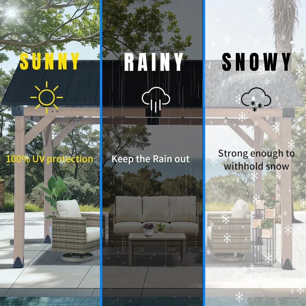 - Durable cedar wood frame with a steel roof delivers steadfast shade and weather protection, so you can enjoy outdoor living from season to season without worry.